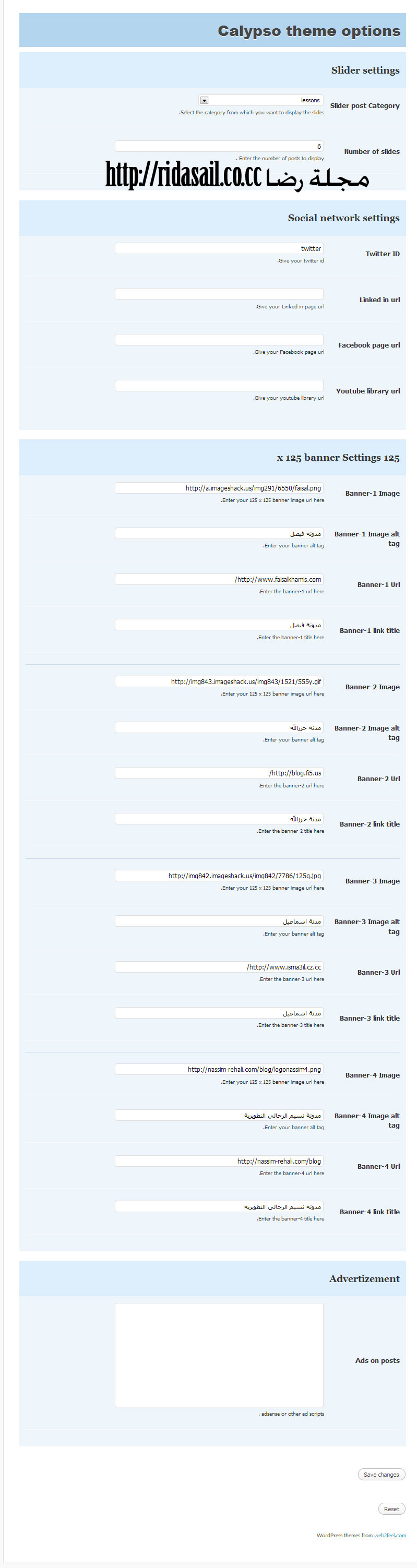 و لوحة تحكم لتخصيص البنرات الاعلانية و روابط الشبكة الاجتماعية و تخصيص تدونات التصنيف و عددها الذي يضهر في السلايدر